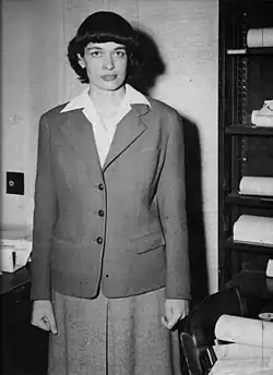 Woods married John Marshall in July 1943. Soon after, she fell pregnant. While she told Enrico Fermi, they agreed not to let Walter Zinn know, for fear that he would insist that she leave the reactor building. She covered up her pregnant belly with her baggy denim work clothes.[13] She rode to work each day on an unheated Army bus, "arriving each morning barely in time to vomit before starting the day's work."[14] The child, a boy called Peter, was born in 1944.[1] She returned to work a few days later.[13]