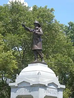 • The Farrier Memorial, a 6-foot (1.8 m) bronze statue of a firefighter atop a domed granite base of 15 feet (4.6 m), was a bequest by Police Captain Frederick T. Farrier to honor the Volunteer Fire Department and was dedicated on November 21, 1931.[38]