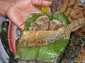 | Nga baung thoke | ငါးပေါင်းသုပ် | Mon | Mixed vegetables and prawn, wrapped in morinda leaves and banana leaves outside. | |