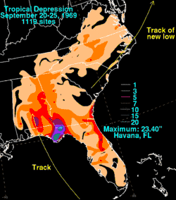 - September 20-22, 1969 – Tropical Depression Twenty-Nine dropped torrential rainfall across southwestern Georgia, with up to 22 inches (560 mm) observed in Attapulgus.[4] Severe local flooding ensued, particularly in Decatur County, causing damage to property and crops, mostly to peanuts that were not threshed.[10]
