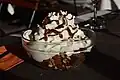 | Somlói galuska | Budapest/Fót | A sponge cake with raisins, walnuts, served with rum, chocolate sauce, and whipped cream. | |
