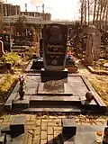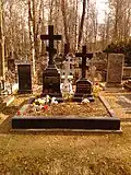 The cemetery was created from land set aside in 1903, with the first burial taking place on 28 May 1905. It was mainly a burial location for the poor of the area, as well as soldiers and sailors who died in the First World War.[1] It rose to prominence in the Second World War when it became a site of numerous mass graves of those who died in the siege of Leningrad from 1941 to 1944.[1] Since then leading figures from a variety of sections of society have been interred in the cemetery. Saint Petersburg's history as a naval base have made the cemetery a popular location for naval officers. Those buried at the Serafimovskoe Cemetery include Giorgi Abashvili, Vladimir Alafuzov, Ivan Yumashev, and Mikhail Zakharov. There are also memorials to several maritime accidents and disasters, including the sinking of the ships Mekhanik Tarasov and Polessk, and the loss of the submarines Kursk and Komsomolets. On 6 July 2019 the fourteen men who died in a fire aboard the submarine Losharik were interred in the cemetery.[2] A memorial also commemorates the dead of the 1981 Pushkin Tu-104 crash, which included a large number of Soviet Navy officers. Other military figures interred in the cemetery include Soviet Air Force Lieutenant General Dmitry Alexandrovich Medvedev, two flying aces of the Korean War; Anatoly Karelin and Mikhail Mikhin, and Major General Sergei Ivanovich Tiulpanov, who commanded the Propaganda Administration of the Soviet Military Administration in Germany. Among the many other Heroes of the Soviet Union who were buried here are Boris Alekseyev, Nikolai Archakov, Ivan Afanasyev, Anton Gurin, Pavel Pavlov, and Fyodor Simakov.[1]