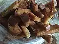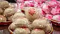India A dessert made with flour, soaked rice, and molten jaggery, fried with oil, and topped with sesame or poppy seeds.