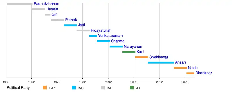 This list is numbered based on vice presidents elected after winning an Indian vice presidential election. The vice president of India does not represent any political party. The colors used in the table indicate the following: