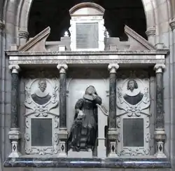 John II Tuckfield (1555–1630) of Tedburn St Mary, purchased Little Fulford from Robert Basset and thenceforth made it his seat.[9] He was the son and heir of John I (c. 1530 – c. 1586/89) and Joan Tuckfield of Crediton[10] John I was son and heir of William Tuckfield clothier of Crediton (died c.1565) and his wife Joan daughter of John Kene of Upton Hellions.[11] William was probably a kinsman of John Tuckfield the wealthy woollen-cloth merchant and Mayor of Exeter in 1549–50,[9] the surviving portrait of whose wife Joan Tuckfield (1506–1573) is one of the oldest paintings in the collection of the Royal Albert Memorial Museum in Exeter. In 1797 the Devon topographer Rev. John Swete visited Little Fulford and recorded in his journal that the "large woollen manufactory" of the Tuckfield family "has ever since subsisted in these parts".[12] An elaborate monument survives in Crediton Church, next to Sir William Peryam's, erected by his son Thomas I Tuckfield (c.1585–1642), which shows a sculpted bust of John II Tuckfield on the left, of his son Thomas I on the right and a full figure of the latter's wife Elizabeth Reynell in the centre. John II Tuckfield married twice: having by his first wife Joan Morrish at least four children, and by his second wife Elizabeth Quicke at least seven children. Including: