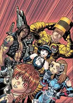 ![]() Cover to "Livewires" #1. Pictured starting from left-top Top: Hollowpoint Ninja and Cornfed. Middle: Gothic Lolita. Bottom: Stem Cell and Social Butterfly. Art by Adam Warren.  | |