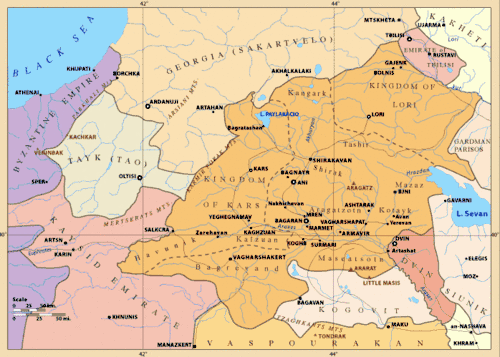 In the 9th century, Prince Guaram conquered Tashir. Available records reveal that neither his father, Ashot, nor grandfather, exercised control over the region.[17] Until 876, Guaram handed over the adjacent region of Ashotsk to his son-in-law Ashot, the future king of Armenia. It was apparently in that period that Tashir was handed over as the name never occurs among the lands under the Bagratids' possession. However, it was later referred to as a land controlled by their Armenian kinsmen.[18]