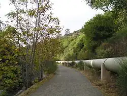 There are two trails between Lexington Reservoir and downtown Los Gatos. The portion of the trail on the west side of the creek is the Los Gatos Creek Trail proper and is a smooth, wide, unpaved trail on an old South Pacific Coast Railroad railway bed and has no access points after the start of the trail at the east side of the dam.[1]