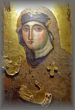 The linden wood on the painting ground is badly eaten away, but the portrait as a whole, especially the face, the gold nimbus and one hand, are still clearly visible.[2] In later times, Mary's interceding hands were covered with gold sheets to protect them from devotional kisses, and a gold cross was added to her shoulder.[3]
