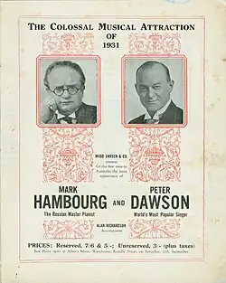 In 1895, Hambourg began his first world tour (aged 16), beginning in Australia, where in (Sydney) he was asked to prolong his stay by six weeks. Returning to London, he deputized for Paderewski at a Philharmonic Society concert playing Anton Rubinstein's Piano Concerto No. 4 in D minor. He first appeared in Paris in 1896, and after that in Brussels and Berlin. He went to the United States in the latter part of 1898, making his New York debut under William Gericke with the Boston Symphony Orchestra, and going on to tour the US. He then returned to London, and in 1901 made his first appearances at the Queen's Hall Proms under Henry Wood. Over the next four years he made another American tour and made visits to Poland, Russia and Germany. (He had met Lenin through Felix Moscheles in London in 1900). In 1906 he made a month-long concert visit to South Africa, taking his own piano by precarious means across the Veldt to a remote location. He first toured in Canada in 1909 and later became friends with the Canadian pianist Harold Bradley.[13]