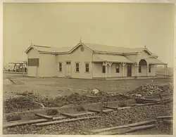 Although the architect is unknown, drawings for the first stage of the station building were approved by Henry Charles Stanley on 24 October 1879, and the contract was awarded to Henry Taylor (junior) on 8 Jan 1880, for £1325. A head station building and a short platform were built. On 24 December 1892 chief draughtsman Henrick Hansen approved alterations to the station and the main platform verandah, the demolition of the buildings extending to the north-west of the head station, and the enlargement of the lamp room. This contract was awarded to John Kyle on 24 January 1893, for £1176. The Station Master's office was enlarged in 1912.[1]