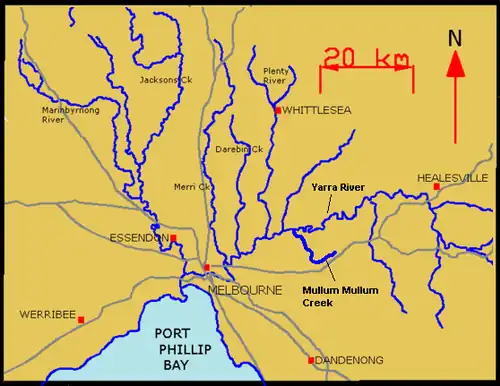 37°45′35″S 144°58′53″E / 37.759756°S 144.981482°E Merri Creek is a waterway in southern parts of Victoria, Australia, which flows through the northern suburbs of Melbourne. It begins near Wallan and flows south for 70 km until joining the Yarra River at Dights Falls. The area where the creek meets the river was traditionally the location for large gatherings of the Wurundjeri people and is thought to have been the location for one of the earliest land treaties in Australia between Indigenous Australians and European settlers.