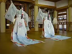 When a miko is serving a Shinto ritual or performing kagura (a shrine maiden dance), she wears a chihaya over the top.[13]