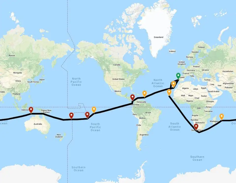Leg 4: Cape Town to St. Helena (1900 nm), to Cape Verde (2400 nm), to Portugal (1600 nm). (5900 miles)