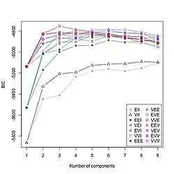 Several of these models correspond to well-known heuristic clustering methods. For example, k-means clustering is equivalent to estimation of the EII clustering model using the classification EM algorithm.[8] The Bayesian information criterion (BIC) can be used to choose the best clustering model as well as the number of clusters. It can also be used as the basis for a method to choose the variables in the clustering model, eliminating variables that are not useful for clustering.[9][10]