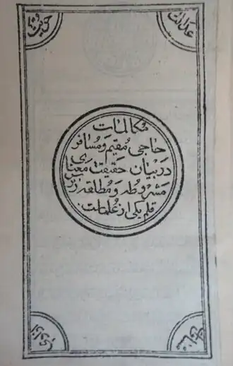 Mokalemate Moqim va Mosafer (transl. Conversation of the Resident and the Traveler, Persian: رساله مقیم و مسافر) is a political treatise by Noorollah Najafi Isfahani. The treatise was published in Isfahan in July 1909.[1][2] This treatise was written in the years between the first and the second Persian Constitutional Revolution. In this treatise, the author presents an Islamic version of the constitutional political system.[3][4] The treatise Moqim va Mosafer, which was written in constitutional history, took a prominent place in its political treatises and explored the concept of constitutional jurisprudence with the idea of a "powerful government". The treatise Moqim va Mosafer proved by the powerful principle that injustice of the constitutional state are less than monarchy and almost controllable; yet it believes that if the constitution leads to mass despotism, there will be a great deal of tyranny that cannot be easily reformed.[5]