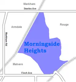 Morningside Heights is a residential neighbourhood in Toronto, Ontario, Canada. It is located in the northeast corner of the city, in the district of Scarborough, just north of the neighbourhood of Malvern and west of Rouge Park and the Rouge. The subdivision, comprising approximately 750 acres (3.0 km2), was one of the last large tracts of undeveloped land within the City of Toronto, located between Finch Avenue East and Steeles Avenue East, from Tapscott Road to the Rouge River.[1]