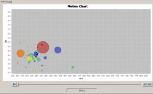 A motion chart is a dynamic bubble chart which allows efficient and interactive exploration and visualization of longitudinal multivariate data.[1] Motion charts provide mechanisms for mapping ordinal, nominal and quantitative variables onto time, 2D coordinate axes, size, colors, glyphs and appearance characteristics, which facilitate the interactive display of multidimensional and temporal data.