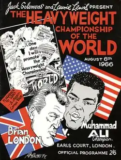 Muhammad Ali vs. Brian London was a professional boxing match contested on 6 August 1966, for the WBC, NYSAC, and The Ring heavyweight championship.[1] The match took place at Earls Court Arena, London, England on 6 August 1966. It was scheduled for fifteen rounds. The match ended in the third round with Ali defeating London by knockout.[2][3][4][5][6]