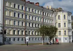The museum building was constructed between 1836 and 1841[21] (or completed after 1842). It was presumably built according to the project of Andrey Gopius, the army architect of the Ural Cossack Army.[22] The building was originally named the 'House of Special Purpose' and was intended to accommodate the engineering and general staff.[21] From 1842[21] or 1844,[22] the 2nd squadron of the Orenburg Neplyuev Military School was located here, with a brigade occupying the southern part of the first floor, which now faces Pravdy Street. It was first used as a teachers' institute in 1878, then as a real school from 1894, and later as the workers' faculty of the Kazan National Research Technological University from 1921 to 1933. Since 1935, it had been known as School No. 30, and since 2010, it has been a physics and mathematics lyceum. During the Great Patriotic War, it also served as hospital No. 16-58.[22] Notably, the building has been recognised as a cultural heritage monument of regional significance since 1987.[2]
