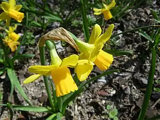 Narcissus 'Tête-à-tête' is known as a dwarf daffodil.[3] Plants emerge in early spring and produce deep yellow blooms.[9] Flowers are 5–6 cm wide.[10] Stems grow up to 15 cm tall with each stem usually possessing from 1 to 3 flowers.[11] Blooms consist of a golden perianth with a deeper yellow cup.[3] The perianth segments are ovate in shape and display a bright yellow hue, accentuated by a subtle white mucro.[12] The segments can be either partly spread or slightly reflexed, with a flat, overlapping arrangement that covers approximately one-fourth of the flower. The inner segments exhibit wavy margins.[12] The cup, located at the centre of the flower, is cylindrical and short, with a broad angle. Near the mouth of the cup, it slightly constricts and takes on a slightly darker tone compared to the perianth. The mouth of the cup is straight or slightly expanded and features six distinct lobes, with a crenate rim.[12] 'Tête-à-tête' is sterile,[13] therefore cannot reproduce naturally via seed and must instead reproduce asexually via bulb offsets.
