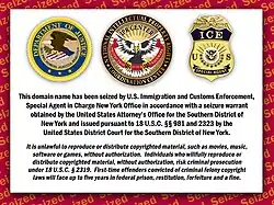This domain name has been seized by U.S. Immigration and Customs Enforcement, Special Agent in Charge New York Office in accordance with a seizure warrant obtained by the United States Attorney's Office for the Southern District of New York. It is unlawful to reproduce or distribute copyrighted material, such as movies, music, software or games, without authorization. Individuals who willfully reproduce or distribute copyrighted material without authorization, risk criminal prosecution under 18 U.S.C ยง 2319. First-time offenders convicted of criminal felony copyright laws will face up to five years in federal prison, restitution, forfeiture and a fine.[13]