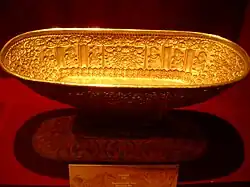 One of the most valuable treasures of ancient Java was the famous Wonoboyo hoard, which originated from the 9th-century Hindu Mataram Kingdom discovered in Wonoboyo, Klaten, Central Java, near Prambanan. The hoard, consisting of a bowl with a scene from the Ramayana, a purse, a water dipper, an umbrella finial, and a spoon or ladle, all were made of gold. Also discovered were ancient Javanese gold coins shaped similarly to a corn seed.