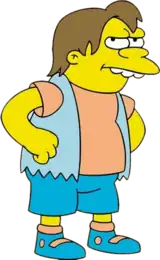 Nelson Mandela Muntz[1] is a fictional character and the lead school bully from the animated television series The Simpsons, where he is best known for his signature mocking laugh "Ha-ha!". He is voiced by Nancy Cartwright. Nelson was first introduced in Season 1's "Bart the General" as an antagonist, but later became more of an anti-hero, continuing to bully those weaker than him while occasionally showing a friendly and sensitive nature underneath. Nelson lives in poverty with his mother in a run-down home, and often shoplifts from convenience stores to get by.