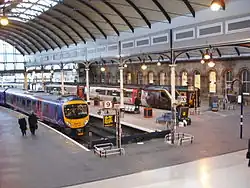 With the electrification of the Manchester to Liverpool Line, from May 2014 a new TPE timetable was introduced featuring an hourly express service between Newcastle and Liverpool via Leeds and Manchester, reducing journey times to Liverpool to three hours as part of the Northern Hub scheme.[19] Services to Leeds/York are also supplemented by London North Eastern Railway and CrossCountry.