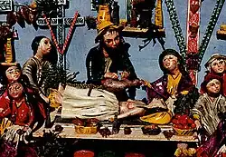 On traditional pieces, the orthodox cajón San Marcos (St. Mark) is something Nicorio comments about his father and grandfather making them, which turned out to make popular sales to the Caucasian buyer.[9][10] While works on traditional themes like the Nativity scene was what seemed to be in popular demand, and prospective clients tried to commission different versions, but Nicorio wanted to take a different direction, and create original works on unique themes.[11]