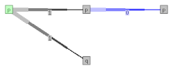 The state diagram for M. It is not deterministic since in state p reading a 1 can lead to p or to q.