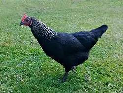 They have a single comb and a red face with black eyes while the legs are slate or black. Plumage is attractively marked and the male has a beautiful silver hackle striped with black as is the neck, back, saddle and wing feathers, while the rest of the plumage is black. The hen's hackle is similar to the cockerels but she has an otherwise rich black feathering all over apart from the throat which is silver laced.