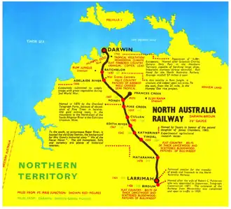 ![]() Excerpt from a 1960s Commonwealth Railways map showing the North Australia Railway | ||||||||||||||||||||||||||||||||||||||||||||||||||||||||||||||||||||||||||||||||||||||||||||||||||||||||||||||||||||||||||||||||||||||||||||||||||||||||||||||||||||||||||||||||||||||||||||||||||||||||||||||||||||||||||||||||||||||||||||||||||||||||||||||||||||||||||||||||||||||||||||||||||||||||||||||||||||||||||||||||||||||||||||||||||||||||||||||||||||||||||||||||||||||||||||||||||||||||||||||||||||||||||||||||||||||||||||||||||||||||||||||||||||||||||||||||||||||||||||||||||||||||||||||||||||||||||||||||||||||||||||||||||||||||||||||||||||||||||||||