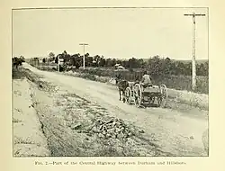 One of the most important steps taken in [statewide road planning] was the creation by the legislature in 1911 of the Central Highway. This was by no means a highway in any practical sense of the word, but was only a projected route for travel through the state. The route was to begin at Morehead City and go through the state from east to west by way of Raleigh, Greensboro, Salisbury and Asheville. All the way it followed closely the line of railroad built by the state in the middle third of the last century. That route, long ago broken up into several routes with various directions, was built on a most circuitous survey.[2][3] But the Central Highway followed its sweeping curves and even today [1931] the magnificent state route number 10 takes the same roundabout course from the seashore to the Tennessee line. In 1911 a Central Highway Committee was appointed with the function of designating the route in detail, and getting the various counties to cooperate in building it through from one end of the state to the other. The idea was to show people what a highway trip through the state would mean. Every year the committee made a trip over the route, traveling by automobile, exhorting the people to good works and telling them what the other counties were doing.[4]