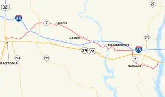 North Carolina Highway 7 (NC 7) is a primary state highway in the U.S. state of North Carolina. Entirely within Gaston County, it connects the towns of Lowell, McAdenville, and Belmont with the city of Gastonia.