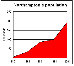 By the end of the 18th century, Northampton had become a major centre of footwear and leather manufacture. In 1801, the population was 7,020; it more than doubled to 15,351 in 1831, attributed to the fact that there was great demand for footwear caused by the Napoleonic Wars of the late 18th and early 19th centuries.[20] A third of the adult males alone were shoemakers at the time.[20] Northampton grew beyond the old town walls and industry grew rapidly with the mechanisation of factories by the middle of the 19th century.[20]