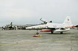 After winning the International Fighter Aircraft Competition, a program aimed at providing effective low-cost fighters to American allies, in 1972 Northrop introduced the second-generation F-5E Tiger II. This upgrade included more powerful engines, larger fuel capacity, greater wing area and improved leading-edge extensions for better turn rates, optional air-to-air refueling, and improved avionics, including air-to-air radar. Primarily used by American allies, it remains in US service to support training exercises. It has served in a wide array of roles, being able to perform both air and ground attack duties; the type was used extensively in the Vietnam War.[2] A total of 1,400 Tiger IIs were built before production ended in 1987. More than 3,800 F-5s and the closely related T-38 advanced trainer aircraft were produced in Hawthorne, California.[3] The F-5N/F variants are in service with the United States Navy and United States Marine Corps as adversary trainers.[4] Over 400 aircraft were in service as of 2021.[5][N 1]