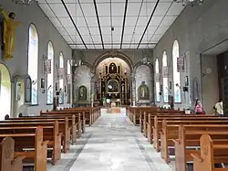The church is known for its 126 steps connecting the local road to the main church on top of the hill.[9][10] It has a Spanish style façade.[9][10] Due to natural calamities and war, only the belfry connected to the church is the remaining original structure of the original 1618 church. Since it became serviceable after the 1937 earthquake, the church was greatly improved into its interior.[6]