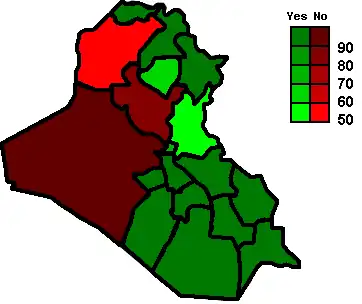 The National Assembly elected in January had drafted a new constitution to be ratified in a national referendum on 15 October 2005. For ratification, the constitution required a majority of national vote, and could be blocked by a two-thirds "no" vote in each of at least three of the 18 governorates. In the actual vote, 79% of the voters voted in favor, and there was a two-thirds "no" vote in only two governorates, both predominantly Sunni. The new Constitution of Iraq was ratified and took effect. Sunni turnout was substantially heavier than for the January elections, but insufficient to block ratification.