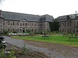 Though the priory remained a community of 12 to 20 men,[4] it eventually became an Augustinian monastery. Between the thirteenth and sixteenth centuries there were several fires. The wars in the southern Netherlands also caused destruction. In 1559, during the ecclesiastical reorganization of southern Netherlands, St Nicolas priory church became a part of the newly established Roman Catholic Diocese of Namur. It was suppressed in 1796.[5] As with other monasteries, the priory's land parcels were sold and became public property. John Francis Pierlot, also known by his religious name Brother Gregory, was a native of Soignies and the 42nd and last prior of the abbey. In 1794, during the revolution, he left the Treasure of Hugo d'Oignies with a farmer and his wife in Falisolle, to prevent its confiscation by the state. In 1817, following the death of the farmer, it was retrieved from its hiding place, returning to the care of Father Pierlot. In 1818, he gave the Treasure to the Sisters of Notre Dame at Namur.[6] After the revolution, however, some members of the religious community remained until 1808.[7] In 1836, the new owner demolished the cloister. Some of the church furniture went to parish churches in the area, such as Saint Christopher (Charleroi) or St. Maarten (Ragnies). A statue of the Virgin from medieval times is now at the Metropolitan Museum of Art in New York City. Situated on 3 hectares in a park-like setting, the building is now privately owned and can be rented for events such as seminars, conventions, and weddings.[8]