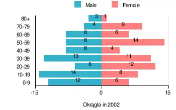 According to the 2002 Poland census, there were 147 people residing in Okrągła village, of whom 51.7% were male and 48.3% were female. In the village, the population was spread out, with 24.5% under the age of 18, 34.7% from 18 to 44, 21.8% from 45 to 64, and 19% who were 65 years of age or older.[1]