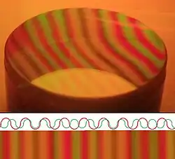 An optical flat test in both green and red. The wavelengths are nearly harmonic opposites (green is λ/4 shorter), so the fringes overlap every fourth red-fringe (every fifth green-fringe), interfering to form yellow fringes.