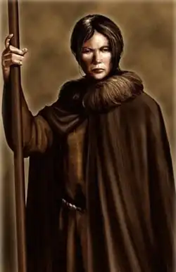 Osha travels with the Stark boys, their direwolves, and Hodor as they head for the Wall. They are crossed by the Reed siblings, Jojen and Meera, who try to reason with Bran. Jojen reveals who they are, and that Bran has a mission to reach the Three-Eyed Raven Beyond the Wall. Over time, Osha grows wary of Jojen and his ideas, and tries to confront him about putting ideas into Bran's head. Jojen reveals that they have no plan of going to the Wall, but instead insists on traveling Beyond the Wall to seek the Three-Eyed Raven. Outraged, Osha warns them of the dangers and threats that lie ahead, which provokes her to tell them about her husband, Bruni, revealing that he had gone missing and came back days later as a White Walker and almost killed Osha.[21] She burnt down her hut with Bruni inside and fled south of the Wall before the dangers became prominent.[22] With her motivations clear, Osha tells Bran she will not go further than the Wall and will not break her promise to Luwin.[23] During a storm, the group take refuge inside an abandoned windmill, while a group of wildlings outside fight. Jojen reveals to Bran that he is a warg after accidentally warging Hodor, which leads him to warging himself into Summer and unknowingly saves Jon Snow and Ygritte. Osha is still frustrated over the entire situation, but Bran suggests that she take Rickon to Last Hearth to seek refuge with House Umber, loyal allies to House Stark. Agreeing, Osha and Rickon say their goodbyes, and part ways.[24]