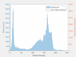 One limitation of the Otsu’s method is that it cannot segment weak objects, as the method searches for a single threshold to separate an image into two classes, namely, foreground and background, in one shot. Because the Otsu’s method looks to segment an image with one threshold, it tends to bias toward the class with the large variance.[14] Iterative triclass thresholding algorithm is a variation of the Otsu’s method to circumvent this limitation.[15] Given an image, at the first iteration, the triclass thresholding algorithm calculates a threshold using the Otsu’s method. Based on threshold , the algorithm calculates mean of pixels above and mean of pixels below . Then the algorithm tentatively separates the image into three classes (hence the name triclass), with the pixels above the upper mean designated as the temporary foreground class and pixels below the lower mean designated as the temporary background class. Pixels fall between are denoted as a to-be-determined (TBD) region. This completes the first iteration of the algorithm. For the second iteration, the Otsu’s method is applied to the TBD region only to obtain a new threshold . The algorithm then calculates the mean of pixels in the TBD region that are above and the mean of pixels in the TBD region that are below . Pixels in the TBD region that are greater than the upper mean are added to the temporary foreground . And pixels in the TBD region that are less than the lower mean are added to the temporary background . Similarly, a new TBD region is obtained, which contains all the pixels falling between . This completes the second iteration. The algorithm then proceeds to the next iteration to process the new TBD region until it meets the stopping criterion. The criterion is that, when the difference between Otsu’s thresholds computed from two consecutive iterations is less than a small number, the iteration shall stop. For the last iteration, pixels above are assigned to the foreground class, and pixels below the threshold are assigned to the background class. At the end, all the temporary foreground pixels are combined to constitute the final foreground. All the temporary background pixels are combined to become the final background. In implementation, the algorithm involves no parameter except for the stopping criterion in terminating the iterations. By iteratively applying the Otsu’s method and gradually shrinking the TBD region for segmentation, the algorithm can obtain a result that preserves weak objects better than the standard Otsu’s method does.