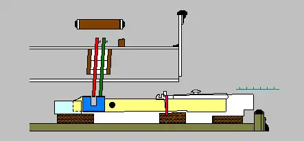For the keys that play the near row of jacks (closer to the player), the mechanism works like this. The portion of the key that engages the lower end of the jack is U-shaped, with each prong of the U ending in a wide, flat upper surface. (This U-shaped part is shown in blue in the false-color diagrams below.) The entire keyboard mechanism can be slightly shifted toward or away from the player, using knobs at the sides of the keyboard. Depending on the location of the keyboard, the jacks will be aligned in different ways against the U, resulting in different strings being played. The three possibilities are shown in the diagrams below, which depict sounding jacks in green, silent ones in red.