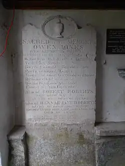 He died in 1814 at his business premises in Upper Thames Street, London, and was buried in the churchyard of All-Hallows-the-Less. When the churchyard was severely damaged by bombing in World War II, his gravestone (which also commemorated his widow and her second husband, Robert Roberts) was removed, and eventually taken to Llanfihangel Glyn Myfyr.[2]
