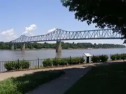 Owensboro Bridge and the Indiana riverbank as seen from Smothers Park in downtown Owensboro