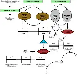 - ^ a b c Farr, SB; Kogoma, T (1991). "Oxidative stress responses in Escherichia coli and Salmonella typhimurium". Microbiol Rev. 55 (4): 561–85. doi:10.1128/mr.55.4.561-585.1991. PMC 372838. PMID 1779927.