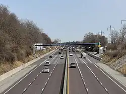 By 2020, about 86 percent of turnpike vehicles already used E-ZPass for payment of tolls.[42] In March 2020, the switch to electronic tolling was made early as a result of the COVID-19 pandemic.[43] The electronic tolling system used toll booths at exits until toll gantries between interchanges were built.[41][44] The first toll gantries on the Northeast Extension and on the mainline east of the Reading interchange began operation in January 2025, and the remainder of the toll gantries along the western portion of the turnpike are expected to begin operation by late 2026.[45][46] After all toll gantries are fully operating, the PTC plans to demolish all toll plazas.