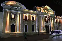 Today's building is the result of the work undertaken by the Venezuelan architect Alejandro Chataing in 1906. It is located on the corner of Gradillas a Monjas opposite the Plaza Bolívar, and occupies half of the plaza's southern section.[7] It is built in an eclectic Neoclassical style with three storeys along the main façade. The main entrance is flanked by double pillars in the composite order. It is crowned by a balcony decorated with composite pilasters and a triangular frontispiece. The east façade is also decorated with composite pillars designed to resemble those of the Roman Forum or similar works from antiquity.[8] The large colonial building has an elegant patio in the interior and also houses the museum.[4]